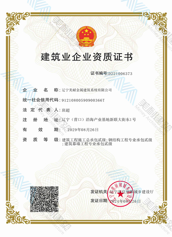 遼寧美耐金屬建筑系統(tǒng)有限公司位于遼寧(營口)沿海產業(yè)基地,專注于預制金屬建筑系統(tǒng)領域,是一家集工業(yè)建筑設計、制作、施工及相關的技術咨詢與服務為一體的綜合性服務企業(yè)。作為國家鋼結構協(xié)會會員、中國建筑金屬結構協(xié)會會員單位與國家高新技術企業(yè),美耐建筑集建筑工程施工總承包、鋼結構工程專業(yè)承包等多種資質于一身,并擁有22項鋼結構建筑領域專利,9項軟件著作權。